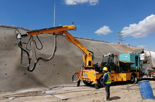 混凝土濕噴機(jī)械手是智能化高適應(yīng)性濕噴混凝土設(shè)備,通過(guò)無(wú)線遙控器操作噴射臂的噴射位置和噴嘴的角度,減少了操作人員與混凝土的接觸,同時(shí)降低了粉塵濃度,改善了作業(yè)環(huán)境,保障了施工人員的身體健康?;炷翝駠姍C(jī)械手廣泛應(yīng)用于鐵路隧道、公路隧道、水利涵洞、礦山巷道、堤壩邊坡、建筑基坑和軍事工程等領(lǐng)域施工中的噴射混凝土支護(hù)作業(yè)。
